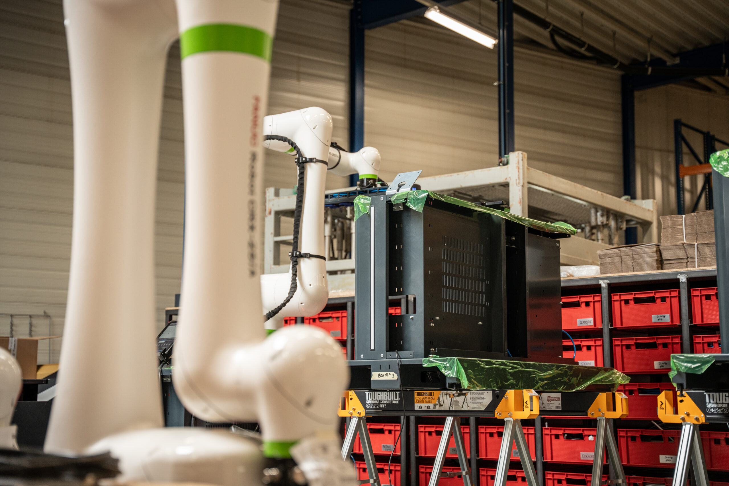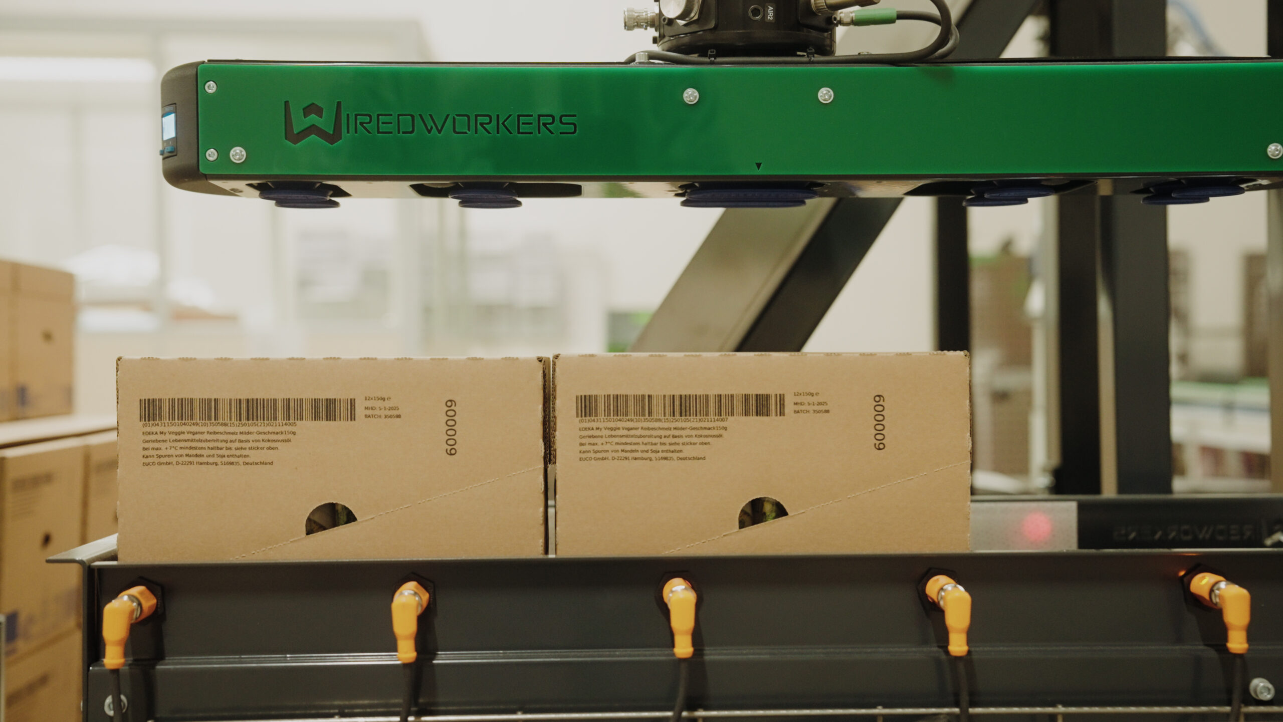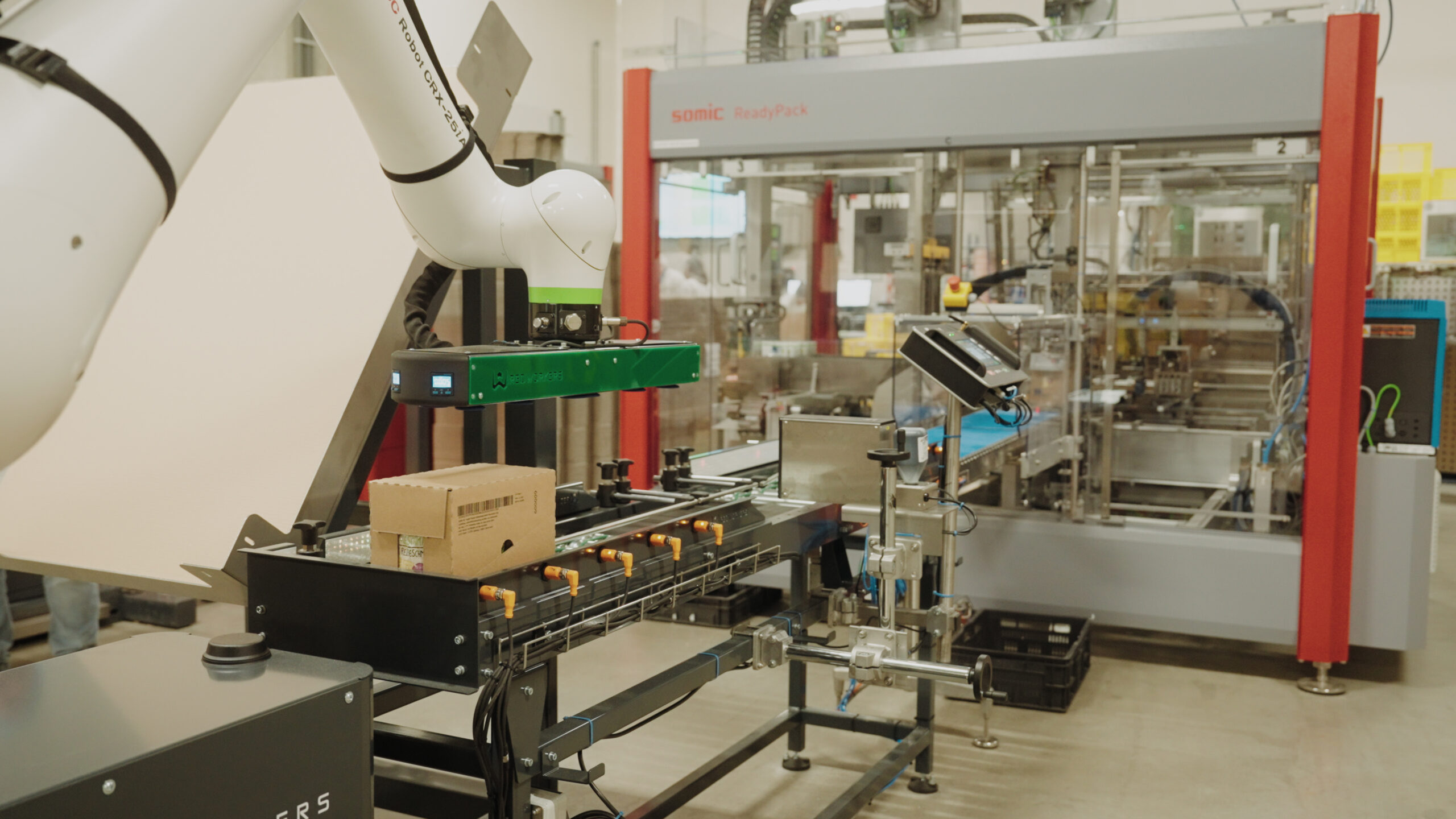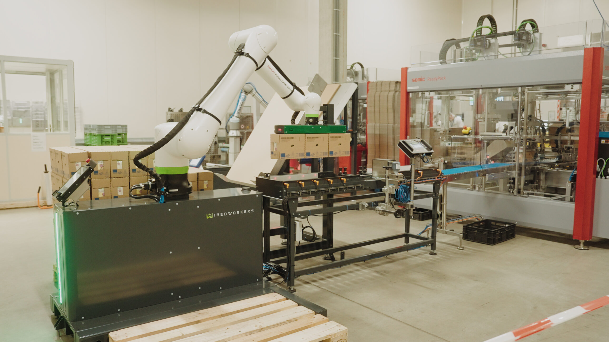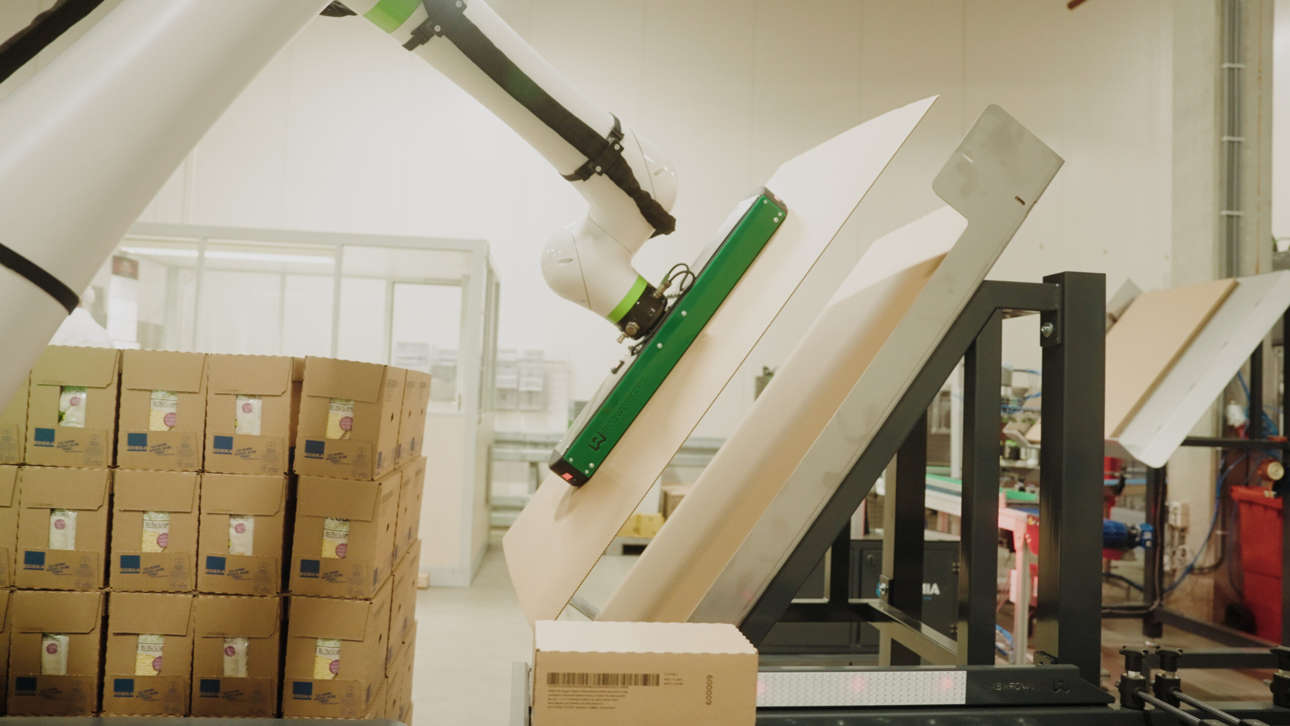 Der Cobot Palletizer ist eine intern entwickelte Plug & Produce-Lösung, die nahtlos in Ihre Verpackungslinie integriert werden kann. Sein standardisiertes Design ermöglicht einen schnellen Einsatz mit minimalen Linienanpassungen, und er ist äußerst mobil, so dass er an mehreren Standorten eingesetzt werden kann. Mit seiner benutzerfreundlichen Software ist die Programmierung neuer Palettenmuster schnell und einfach.